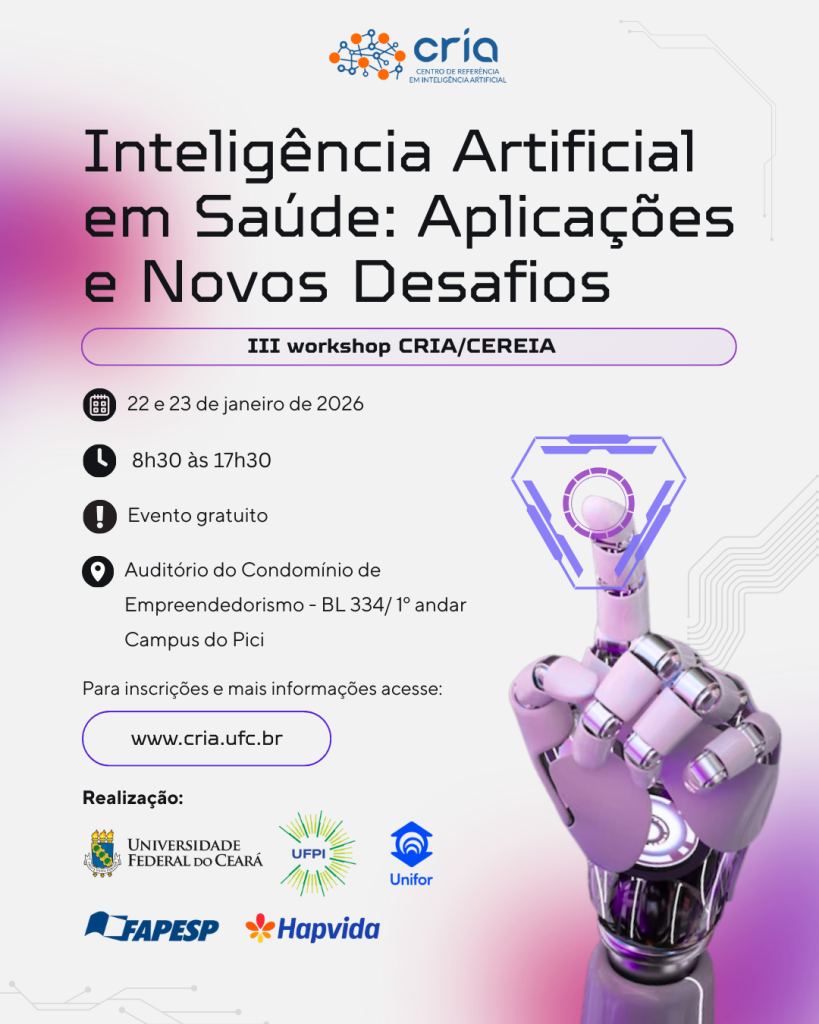 O Centro de Referência em Inteligência Artificial (CRIA) da Universidade Federal do Ceará (UFC) realiza o III Workshop CRIA/CEREIA: Inteligência Artificial em Saúde – Aplicações e Novos Desafios. O evento acontece nos dias 22 e 23 de janeiro, das 8h30 às 17h30.